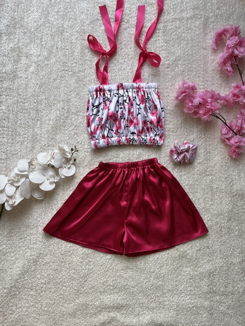 ست نیم تنه شورتک ساتن شکوفه صورتی