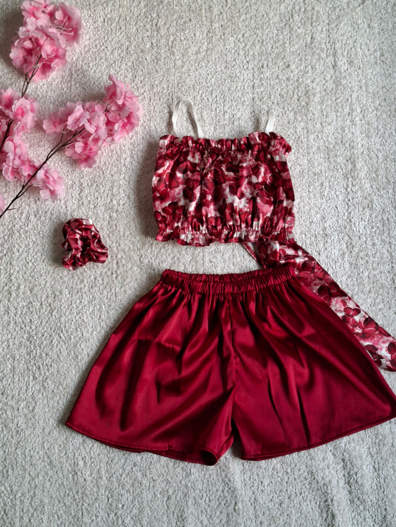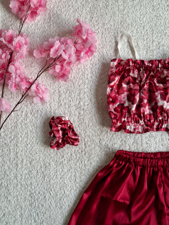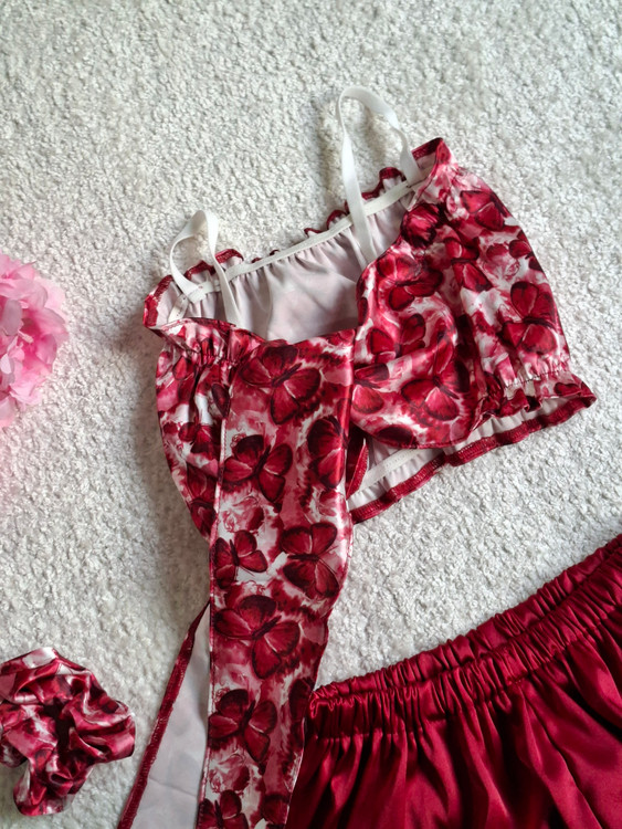 ست نیم تنه شورتک ساتن طرح پروانه البالویی