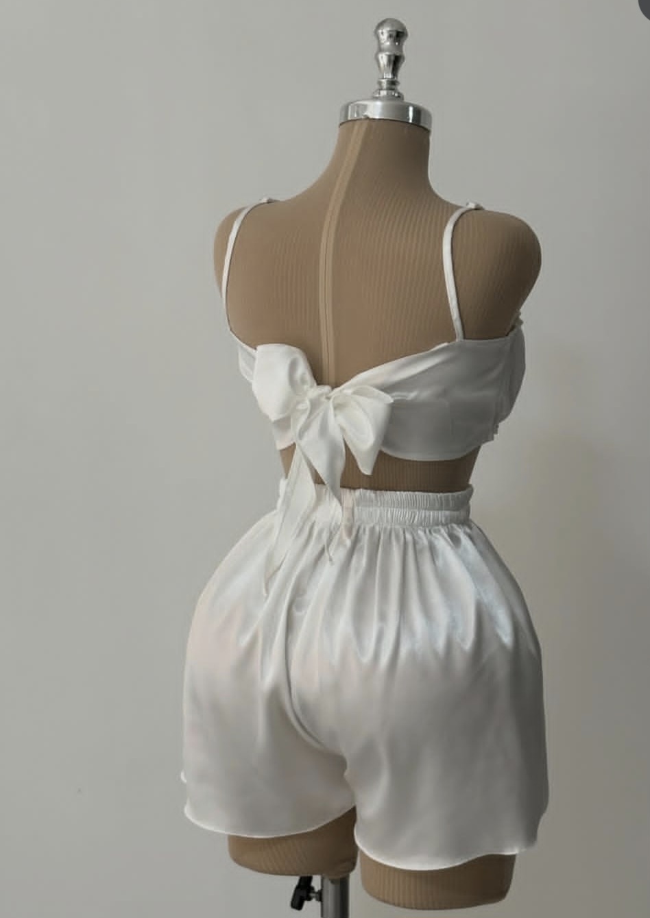 نیم تنه شورتک ساتن✨️ جنس:ساتن ابریشم🌸 بند قابل تنظیم🪽 از پشت گره میخوره و پاپیونی میشه🌿 سایزبندی:۳۶_۴۲فری سایزه