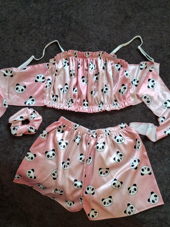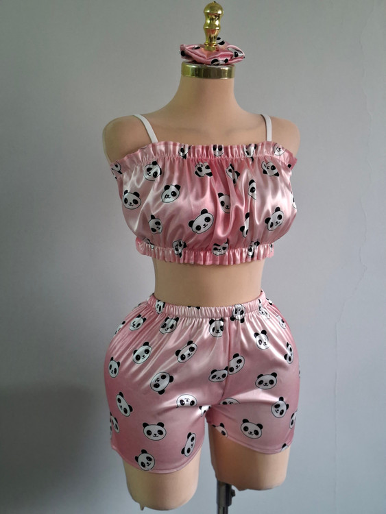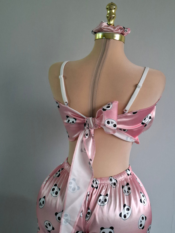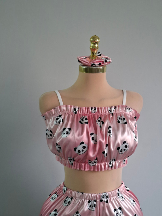 ست نیمتنه شورتک ساتن طرح پاندا صورتی