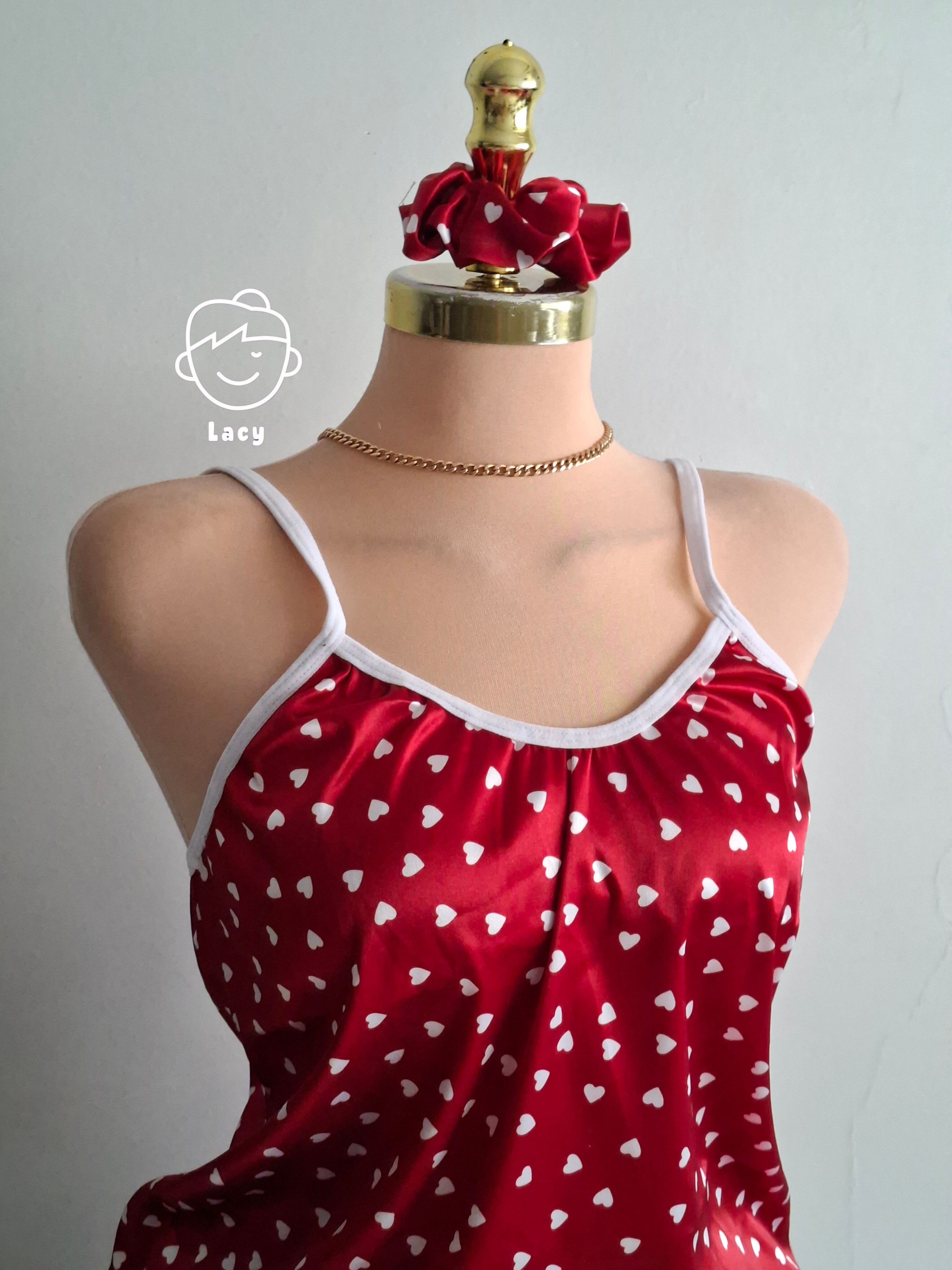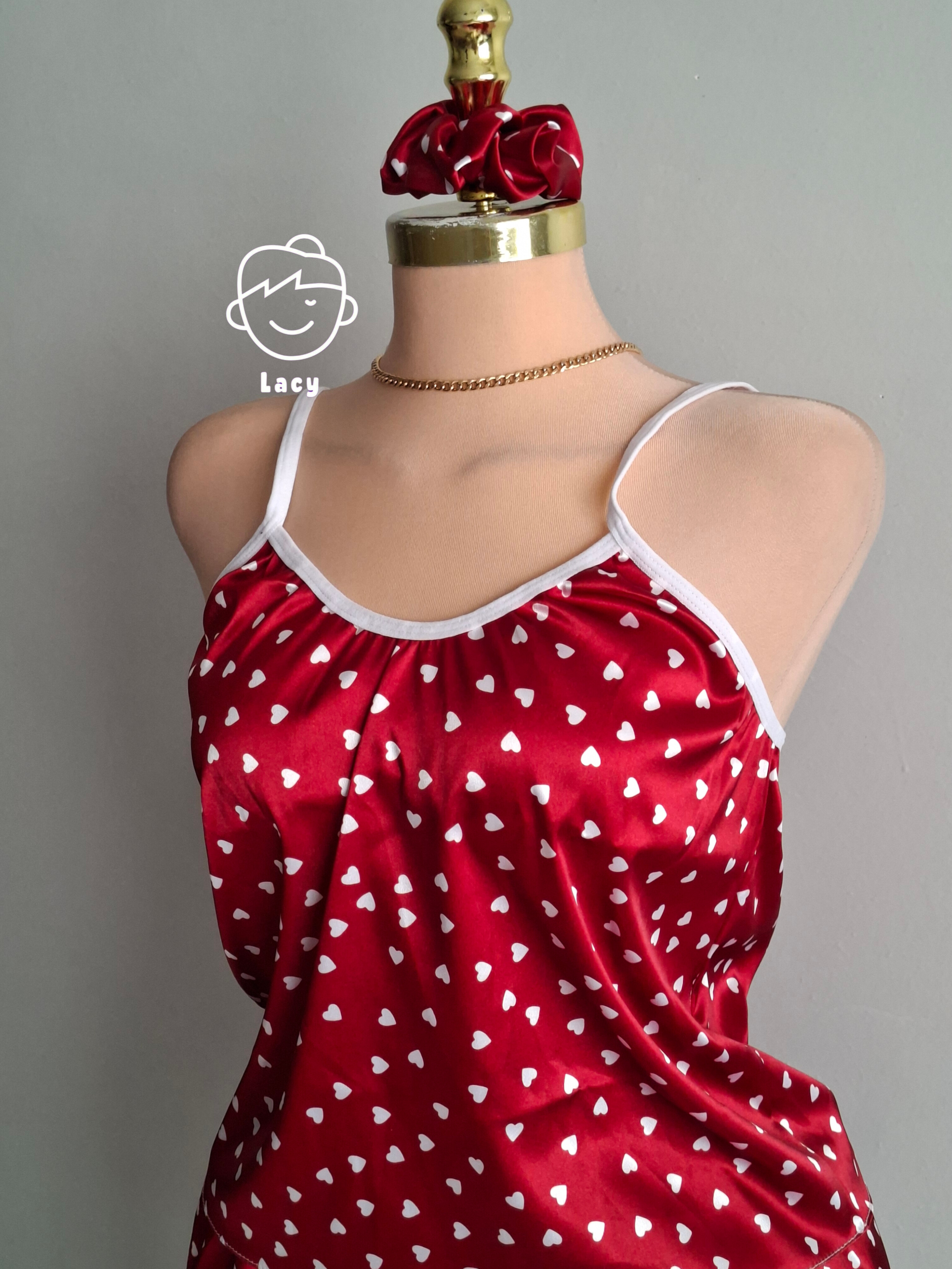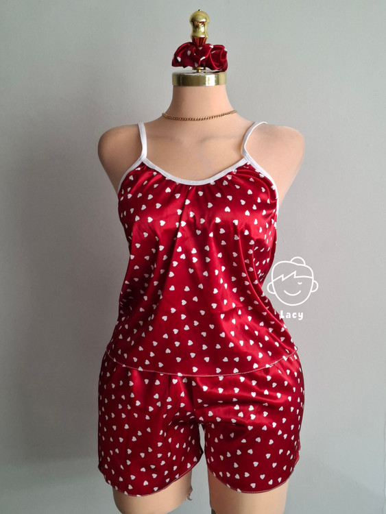 ست تاپ وشورتک ساتن طرح قلب قرمز