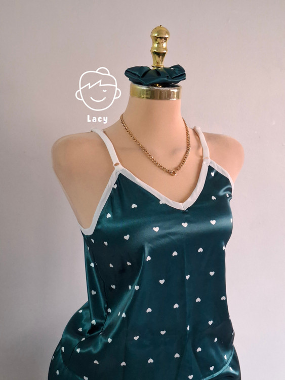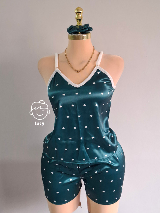 ست تاپ وشورتک ساتن طرح قلب سبز